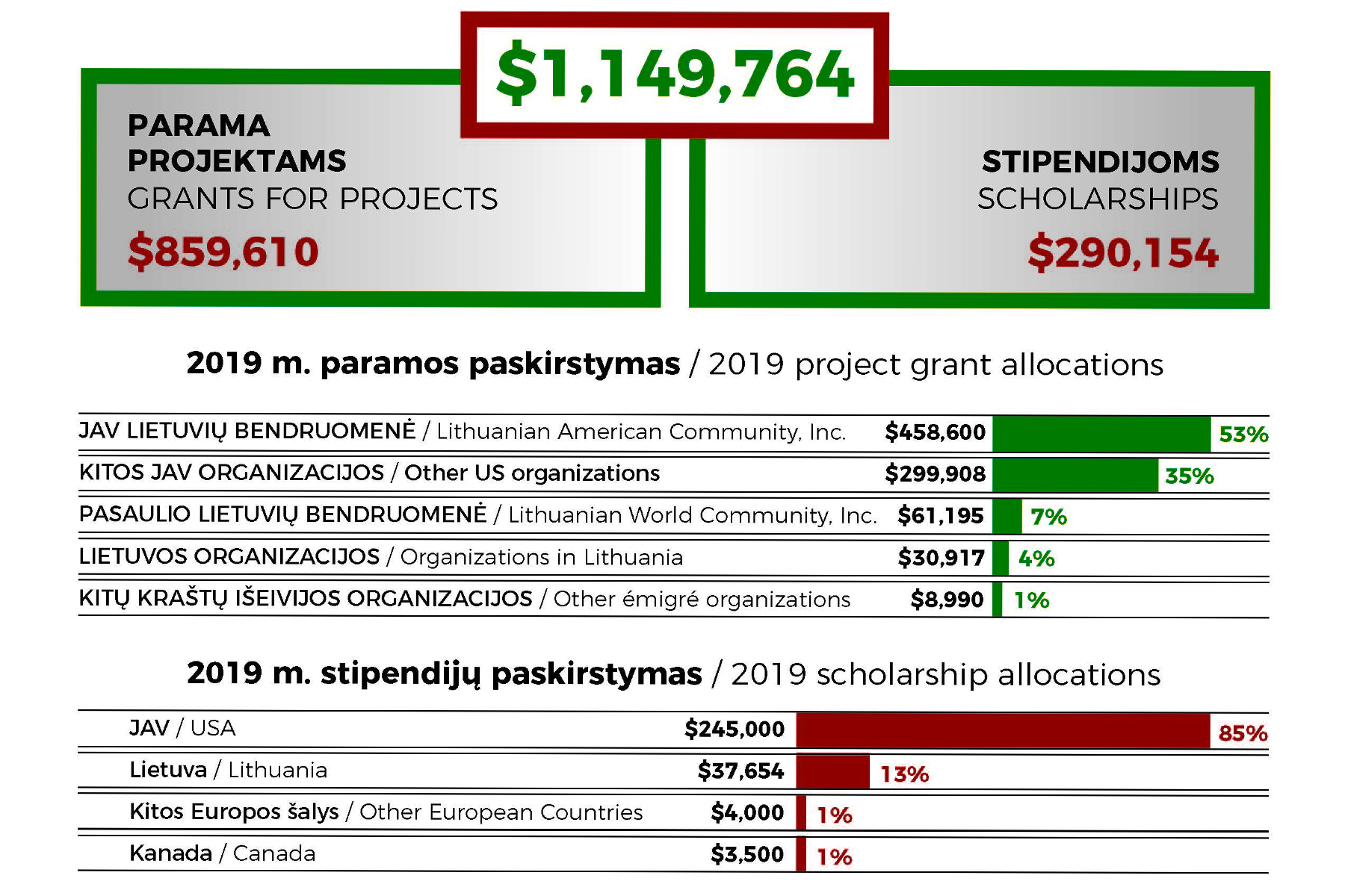 Lietuvių Fondas veikia ir lėšas skirsto laikydamasis JAV Section 501(c) (3) of the Internal Revenue Code paragrafo. Skirstant paramą projektams ir stipendijas vadovaujamasi paramos ir stipendijų pirmenybės gairėmis, kurios yra patvirtintos LF direktorių tarybos. 2019 metais projektų paramai ir stipendijoms iš viso išdalinti 1,149,764 dol. (liko neišdalinti 236 dol.)