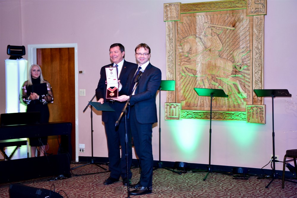 Svečiai plojimais sutiko LF tarybos nario, ne vienerius metus ėjusio LF tarybos pirmininko ir LF valdybos pirmininko pareigas, Mariaus Kasniūno apdovanojimą LR užsienio reikalų ministerijos garbės ženklu ,,Lietuvos diplomatijos žvaigždė“. Apdovanojimą įteikė ambasadorius R. Kriščiūnas.